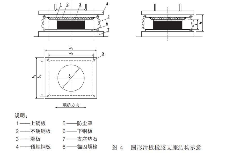 滑板橡膠支座由板式橡膠支座、滑板(通過熱硫化與板式橡膠支座粘接)、鏡面不銹鋼板、上下鋼板、錨固螺栓本標(biāo)準(zhǔn)JT/T 4-2019代替JT/T 4-2004《公路橋梁板式橡膠支座》和 JT/T 663-2006《公路橋梁板式橡膠支座規(guī)格系列》。本標(biāo)準(zhǔn)以JT/T 4-2004《公路橋梁板式橡膠支座》為主,整合了JT/T 663-2006《公路橋梁板式橡膠支座規(guī)格系列》的內(nèi)容,與JT/T 4-2004相比,主要技術(shù)變化如下: